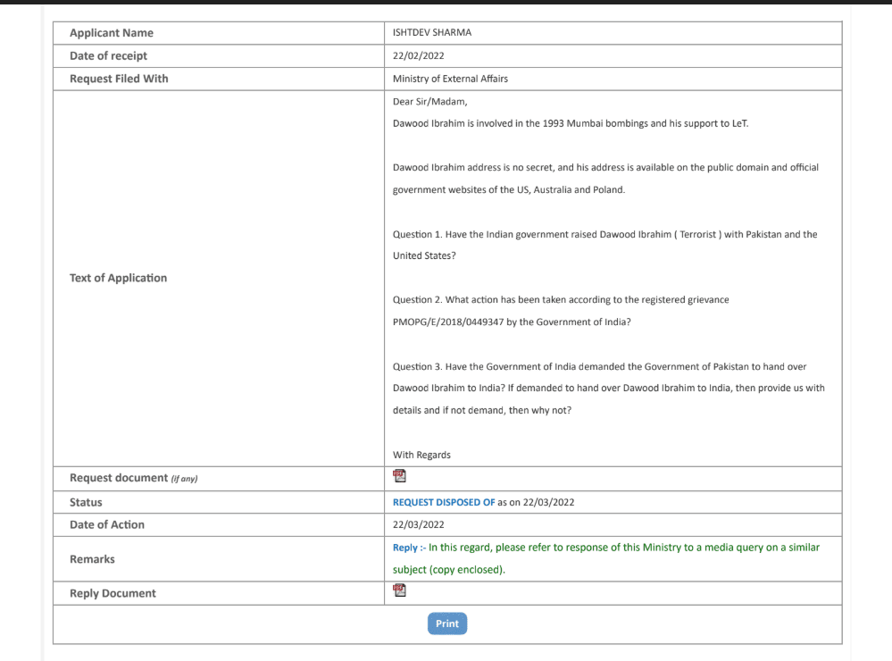 19 Sept 2018PMOPG/E/2018/0449347Helpful FoundationPrime Minister’s Office (PMO)Detailed information on Dawood Ibrahim, including aliases, addresses in Karachi, passport details, and international referencesMarked Disposed; no detailed action report shared