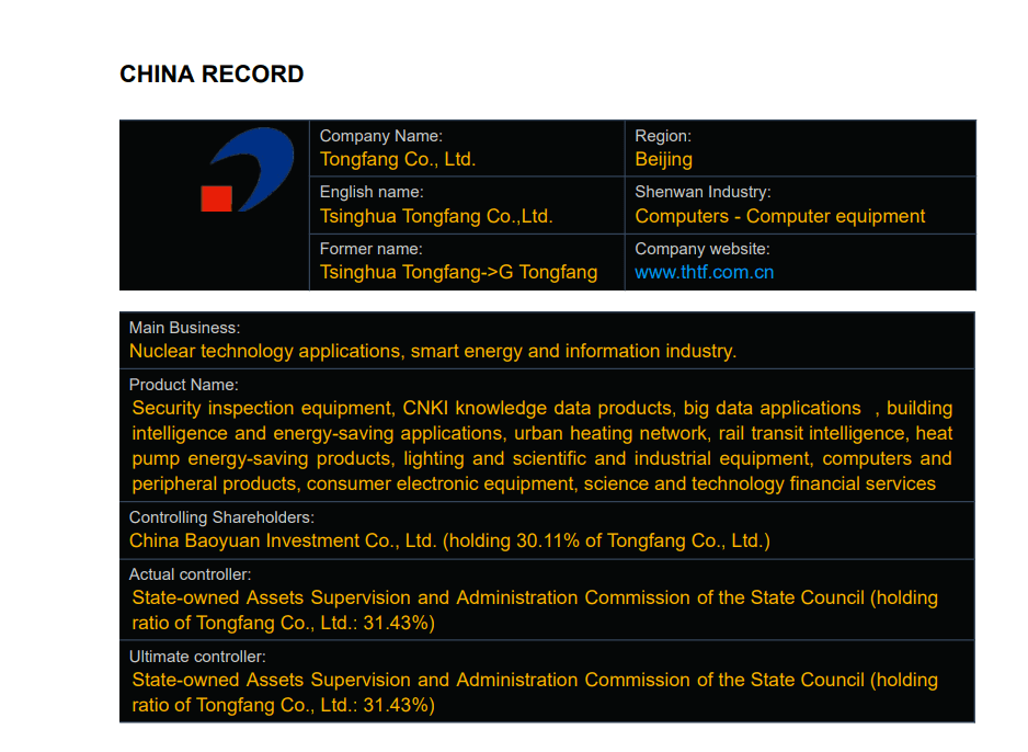 - Tsinghua Tongfang Co., Ltd. has been reported to have ownership links with China National Nuclear Corporation (CNNC), a Chinese state-owned enterprise