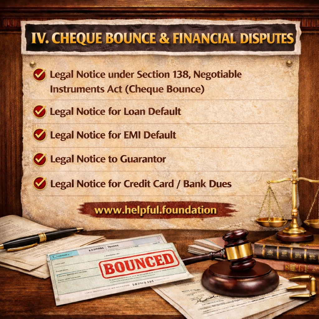 • Cheque Bounce & Financial Disputes – Section 138 NI Act notices, loan default, bank/NBFC recovery issues
