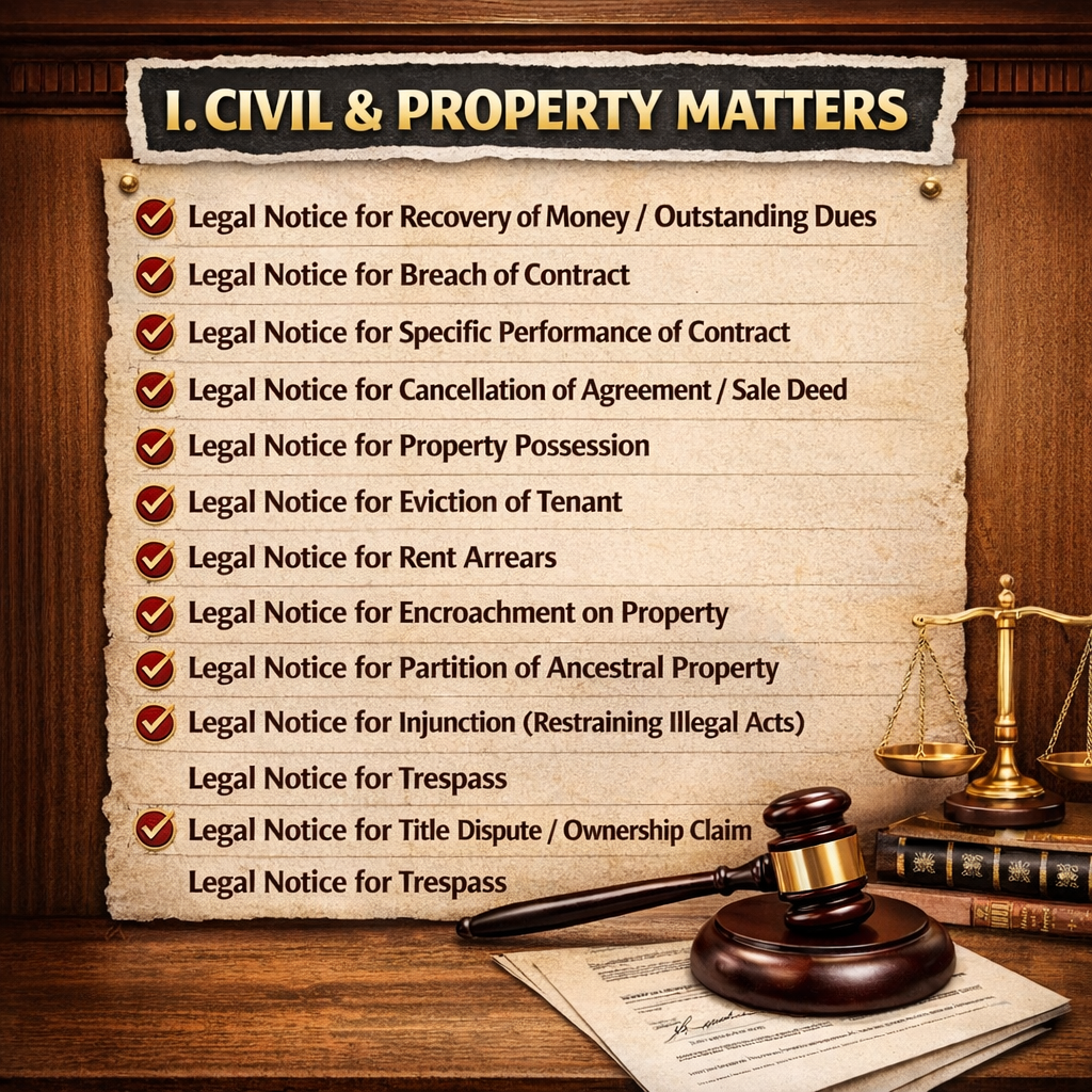 • Civil & Property Matters – recovery, breach of contract, possession, eviction, injunctions, partition, and title disputes