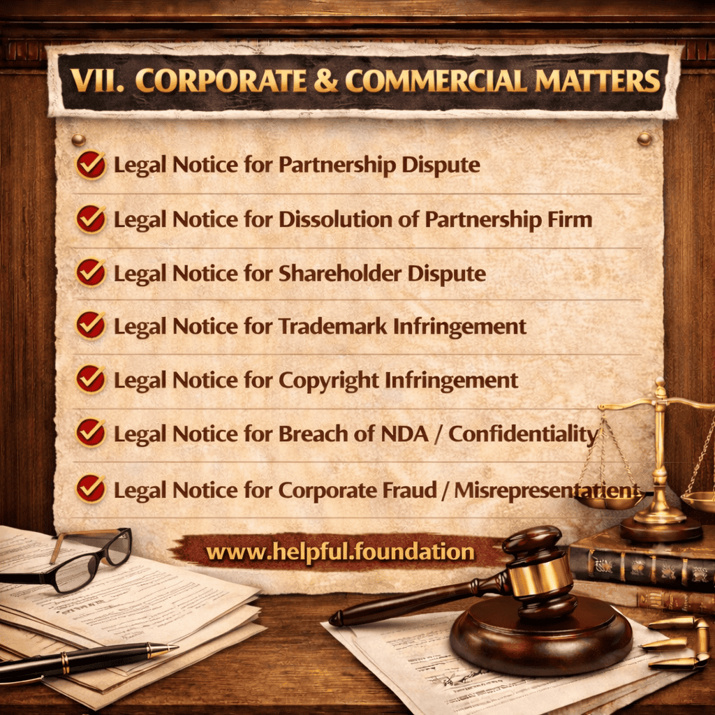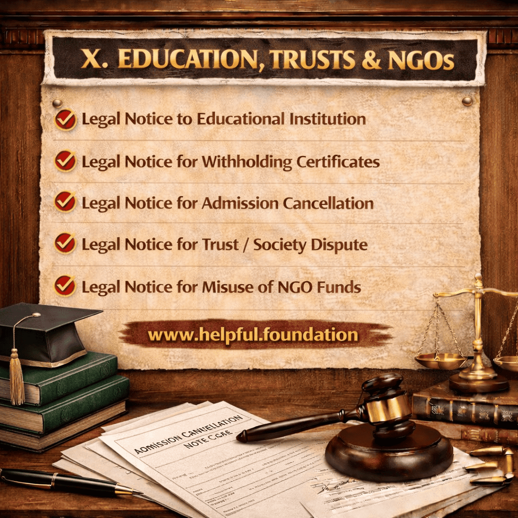 This bundle includes 65 professionally drafted legal notice templates covering Civil, Criminal, Family, Property, Corporate, Cyber Law, Consumer, Employment, Government, Education, Trust & NGO matters. All drafts are structured as per Indian legal practice.