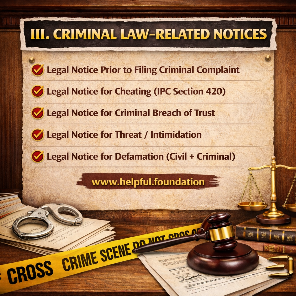 • Criminal Law–Related Notices – cheating, intimidation, police inaction, criminal defamation