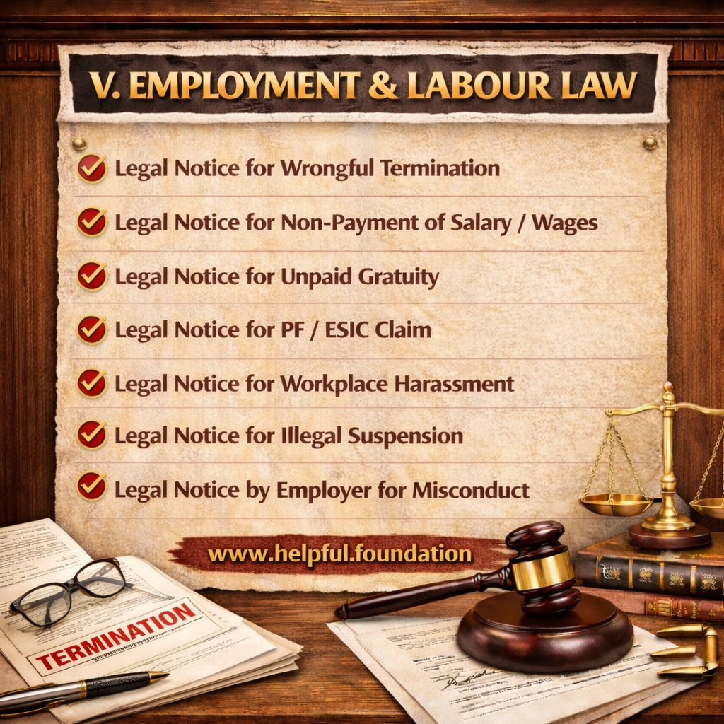 • Employment & Labour Law – wrongful termination, salary dues, show-cause replies