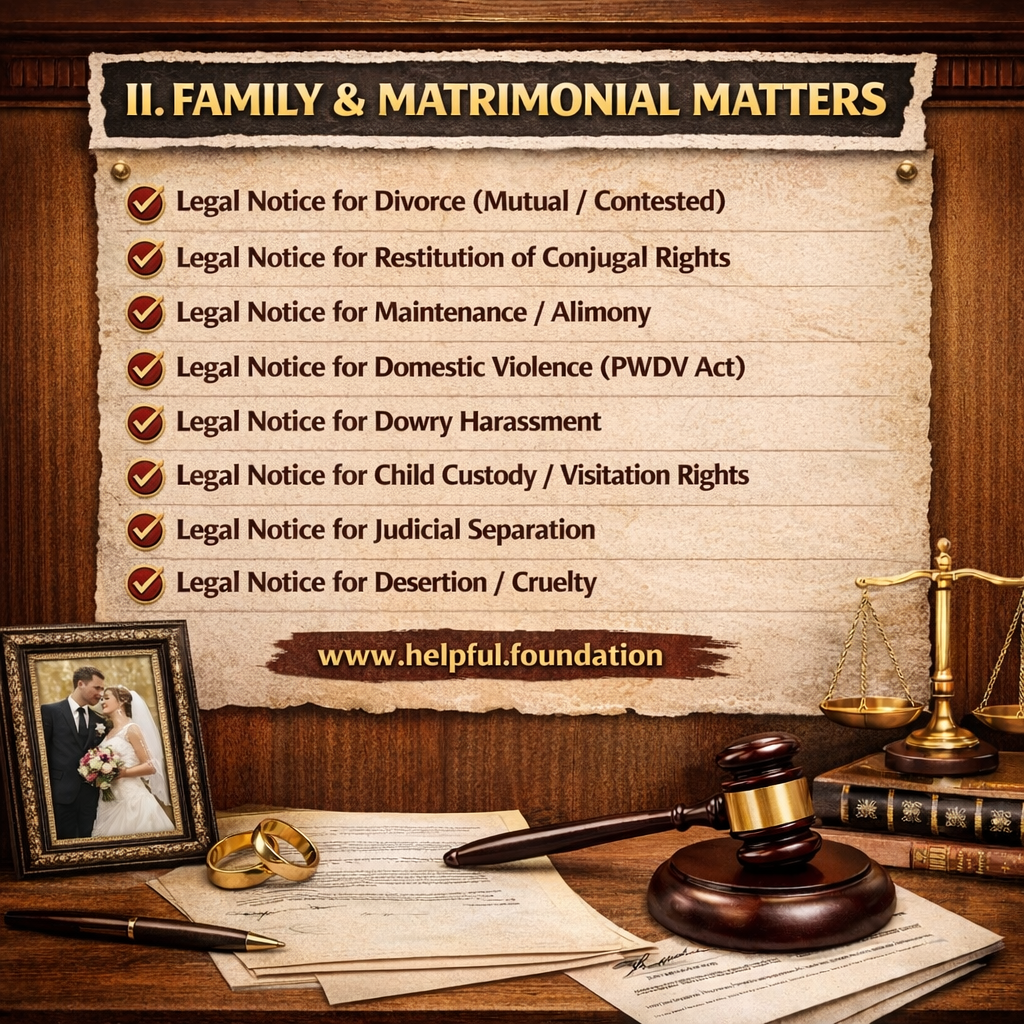 • Family & Matrimonial Law – divorce, maintenance, domestic violence, dowry harassment
